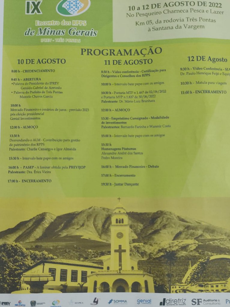 Nos dias 10, 11 e 12 de agosto, membros dos conselhos administrativo e fiscal, comitê de investimentos, superintendete e controlador interno participaram do IX Encontro dos RPPS de Minas Gerais. O evento, que ocorre todos os anos na cidade de Três Pontas-MG, reuniu RPPS de Minas Gerais e de outros estados.